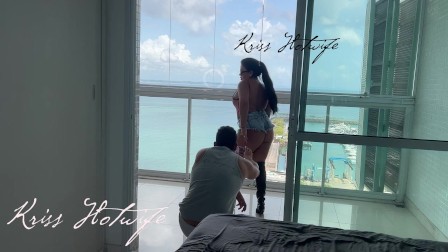 My husband's cuckold filming me showing off on the balcony to the males in the pool