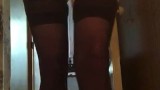 Длинные ноги, высокие каблуки, чулки. Стройная брюнетка танцует стриптиз. Футджоб в чулках